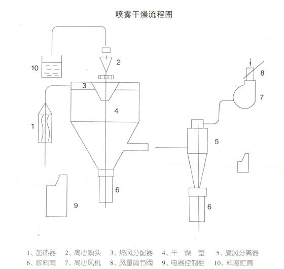 本機(jī)的工作原理是空氣通過過濾器的加熱裝置后,進(jìn)入干燥室頂部的熱風(fēng)分配器,通過熱風(fēng)分配器的熱空氣均勻地進(jìn)入干燥室內(nèi),并呈螺旋狀轉(zhuǎn)動(dòng),同時(shí)將料液送到安裝在干燥室頂部的離心霧化器,料液被噴成極小的霧狀液滴,使料液和熱空氣接觸的表面積大大增加,水份迅速蒸發(fā),在極短的時(shí)間內(nèi)完成干燥過程。